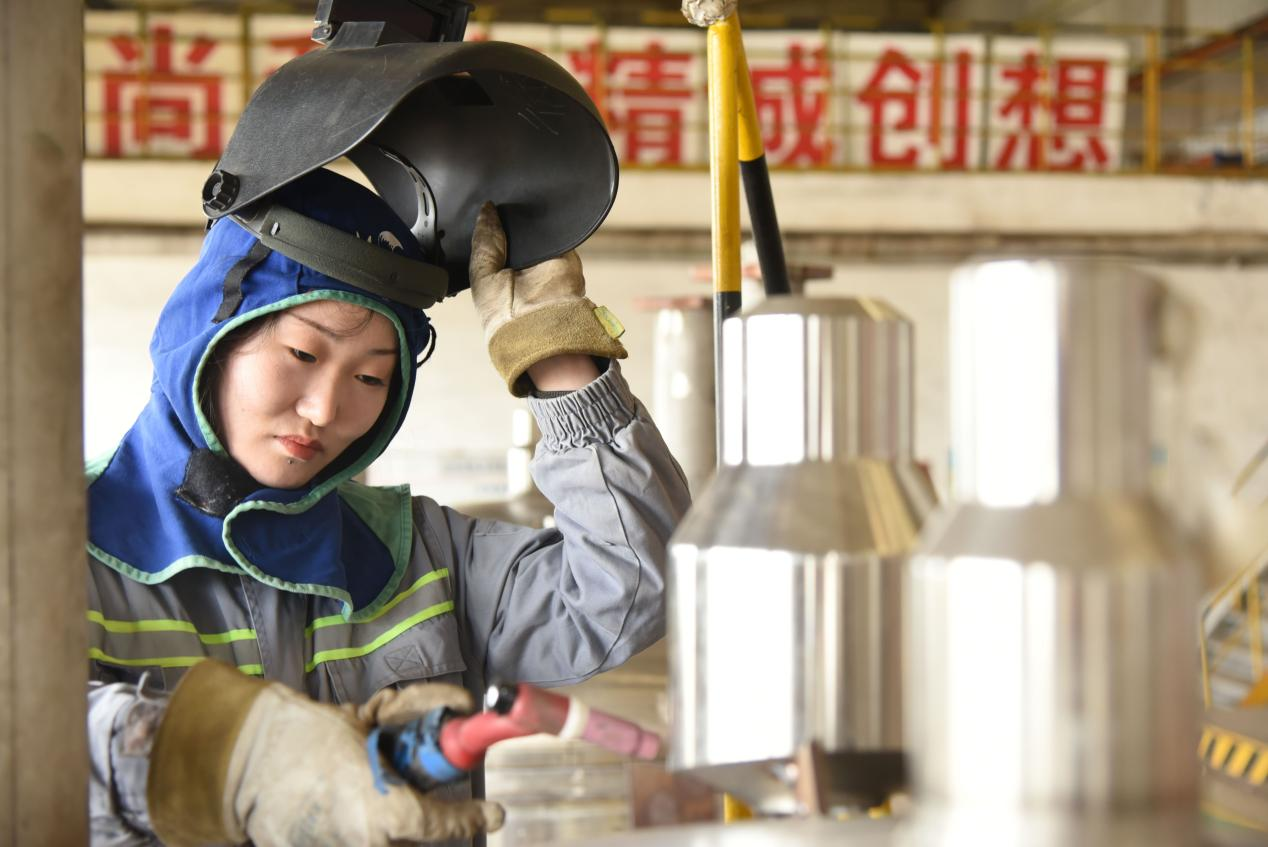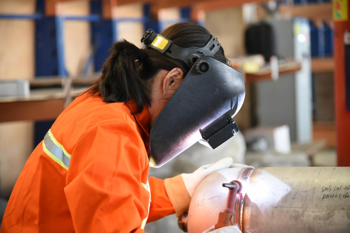 技艺精进的同时,徐颖慧不忘大胆创新。在管道氩弧焊(钨极惰性气体保护电弧焊)过程中,为了保护不锈钢管道焊缝不被氧化,焊工们需要在焊接前向管内充入惰性气体——氩气,并封堵管道两端后再进行焊接。封堵管道口所用的工具是车间清洁用的棉布。焊接过程中,徐颖慧发现随着焊接位置的变化,焊接试件在转动时棉布极易脱落和燃烧。没有了氩气保护,焊缝就不合格,产品又要重新返工。“相当于白干,不仅我自己遇到这样的情况,我的同事也遭受过同样的问题,为什么不做几套工具把棉布替换掉呢?”她在心里盘算着。徐颖慧参照不同规格管道的尺寸,用不锈钢制作了一整套充氩工装。“我就是把想法落地,让后续的焊接更高效更方便。”正是这个不起眼的“小改良”,在后续生产中为企业节约了三分之一的氩气,使生产流程变得更为安全可控,进一步保证了产品的焊接质量。