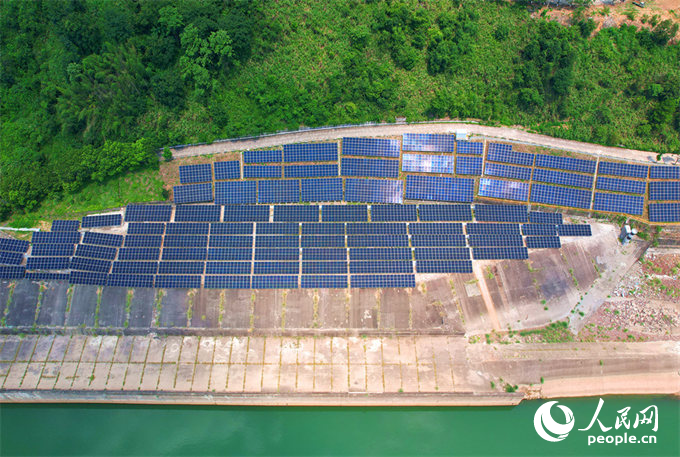 大坝边坡上的光伏发电板。人民网记者 刘宾摄