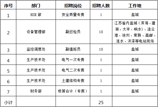 1.开云手机在线江苏新能源有限公司:位于江苏省盐城市解放南路58号中建大厦(主城区繁华地段、商业中心),是江苏公司陆上新能源的平台公司,目前投产4个陆上风电场和7个光伏电站。2018年,公司投产新能源装机容量达到91.4万千瓦,利润处于行业先进水平。该公司在国内率先实现了新能源“无人值班、少人值守、远程监控”,组建了开云手机在线盐城新能源生产运营中心,实现了新能源项目化零为整,资源的整合优化。该公司招聘岗位如下: