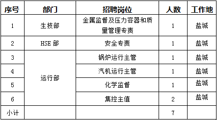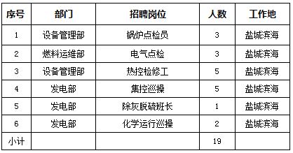 4.盐城热电有限责任公司:位于江苏省盐城经济技术开发区境内,系盐城市城市基础设施工程,现建成1×130吨/小时+2×75吨/小时锅炉3台,15MW+9MW发电机组2台,拥有供热管网总长54.6公里,形成年发电1.6亿千瓦时,供汽80万吨的生产能力,承担着盐城市南市区、城南新区、盐城经济技术开发区和盐都新区近80家企事业单位的供热任务。该公司招聘岗位如下: