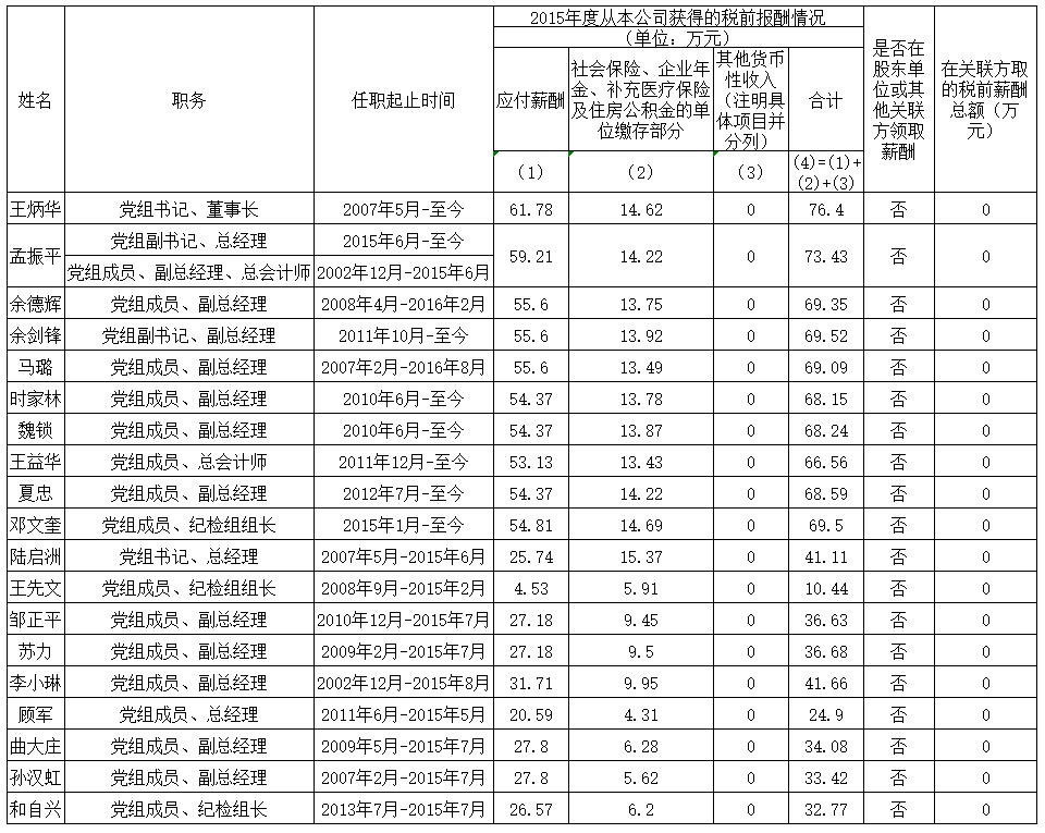 备注:上表披露信息为我公司企业负责人2015年度全部应发税前薪酬,按国家规定由单位缴存各种社会保险等。其中,第(1)项由国务院国资委核定。