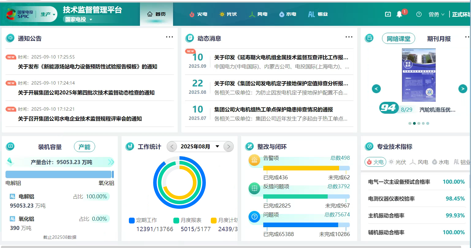 自9月1日试运行以来,平台运行稳定,数据流畅,目前已成功接入黄河公司、内蒙古公司、铝电公司、青海省投等4家二级单位所属鑫业公司、霍煤鸿骏铝电等8家电解铝企业。通过技术监督管理平台的数据穿透分析、智能统计预警、分级信息共享等功能,可实现对电解铝企业技术监督的统一管控,进一步提升涉铝企业技术监督日常管理的规范化水平,为铝业可持续健康发展提供了有力支撑。