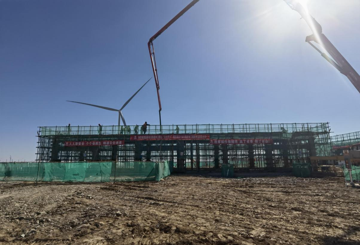 该输变电工程作为整个风电项目电力输送的核心枢纽,承担着电能汇集、升压及外送的重要功能,工程涵盖变电站二次室、主控室、蓄电池室、35千伏配电室等多个关键建筑物,总建筑面积达580.6平方米。自开工建设以来,铝电公司中卫新能源克服地质条件复杂、施工周期紧、交叉作业多等多重挑战,严格遵循“安全第一、质量至上、效率优先”的原则,科学制定施工方案,优化资源配置,通过强化全过程质量管控与安全监督,有效保障了各施工环节的有序衔接与高标准推进,确保了主体结构按期、优质完成封顶。