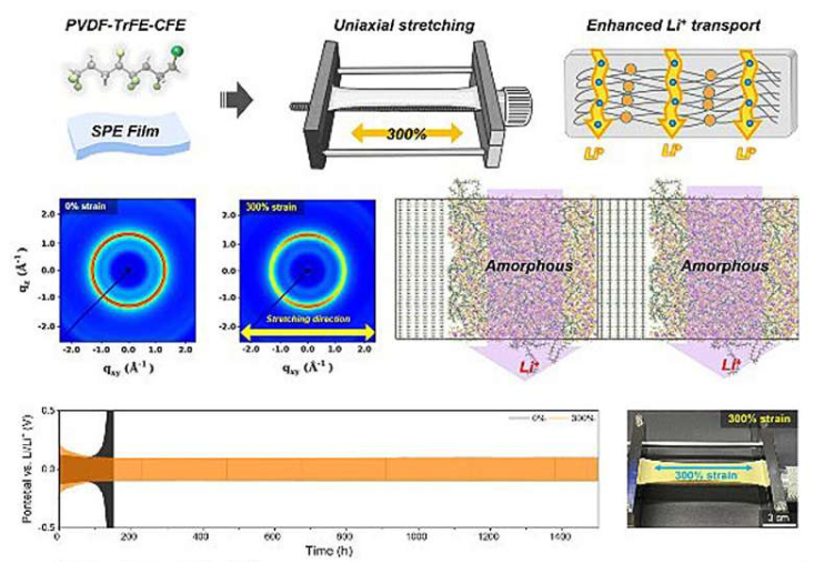 蔚山科学技术院与淑明女子大学联合研究团队开发出一种新型固态电池电解质技术,通过物理拉伸方法显著提升聚合物电解质性能。这项固态电池电解质技术采用单轴拉伸工艺排列氟化聚合物分子链,形成连续离子通道,有效改善锂离子传输效率。