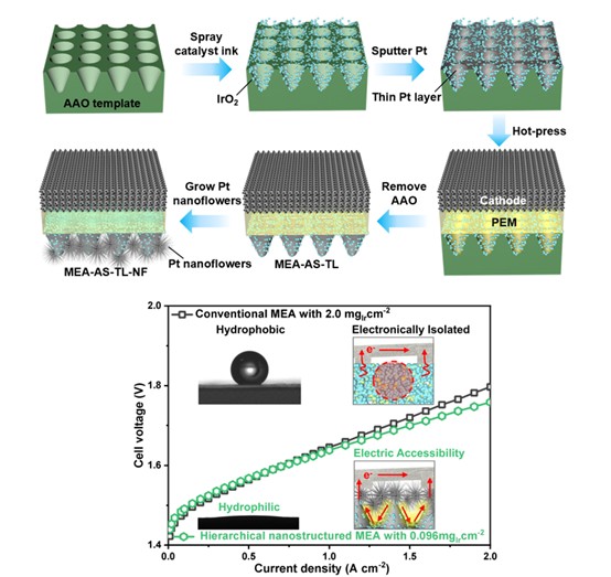 近期,中国科学院上海高等研究院研究团队,提出“锥状阵列+超薄Pt层+Pt纳米花”的多层级结构设计理念。研究通过精准构建纳米压印光刻、离子溅射、原位生长三步工艺,可同时解决传统MEA导电性和传质受限两大痛点。同时,超薄Pt层兼具使面内导电性提升12.3倍,并作为成核位点诱导Pt纳米花生长的双重功能,可实现结构与性能协同优化,进而实现0.096mg cm??低Ir负载下的高性能,较传统MEA节省95%以上Ir,且在2.0A cm??下槽压(1.758V)优于高Ir负载的传统MEA(1.797V@ 2mg cm-2),为质子交换膜水电解的低Ir化应用提供了新思路。