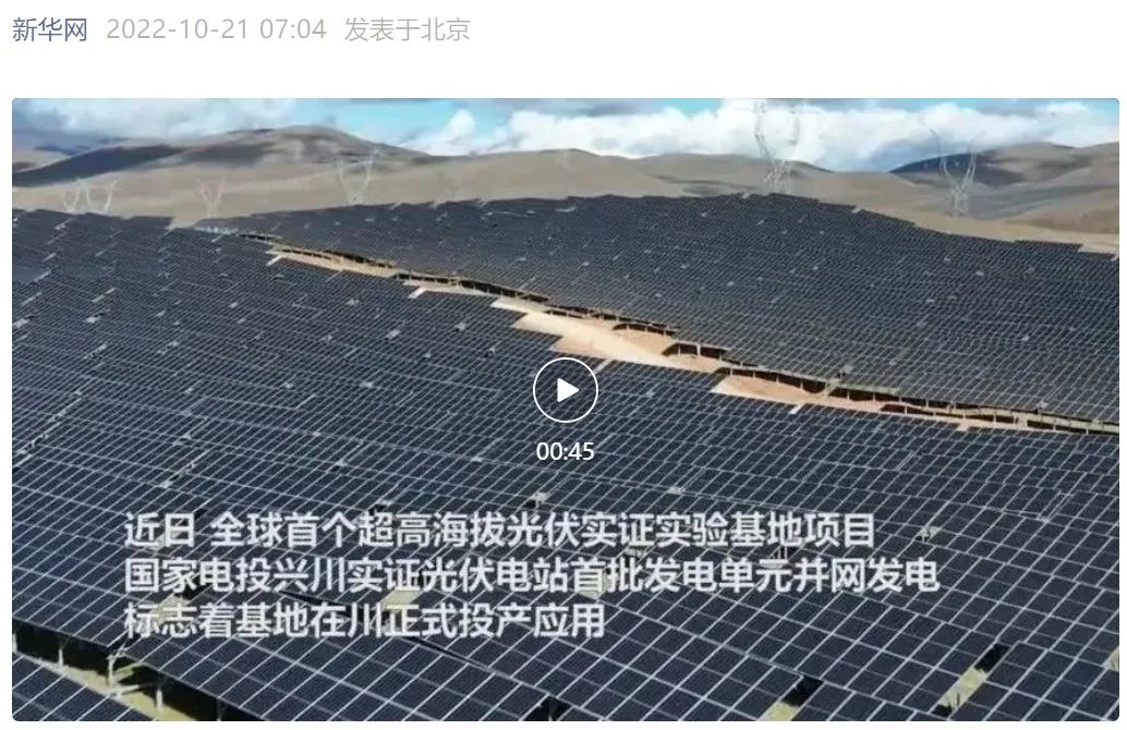 10月21日,新华网官方微信号刊发《全球首个,正式投产!》一文,3小时阅读量10万+。报道称,超高海拔光伏实证实验基地项目——开云手机在线兴川实证光伏电站首批发电单元并网发电,标志着四川甘孜州兴川光伏实证实验基地正式投产应用。电站投运后将填补我国光伏实证基地在超高海拔、中纬度地区的空白,为川藏高原以及全国范围内相似场景地区的光伏建设提供参考。以下为报道全文: