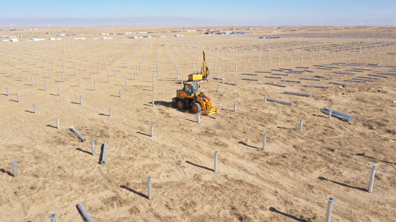 海南州特高压外送通道配套电源点220万光伏项目的建设现场之一,图为正在安装的阵列区钢管桩