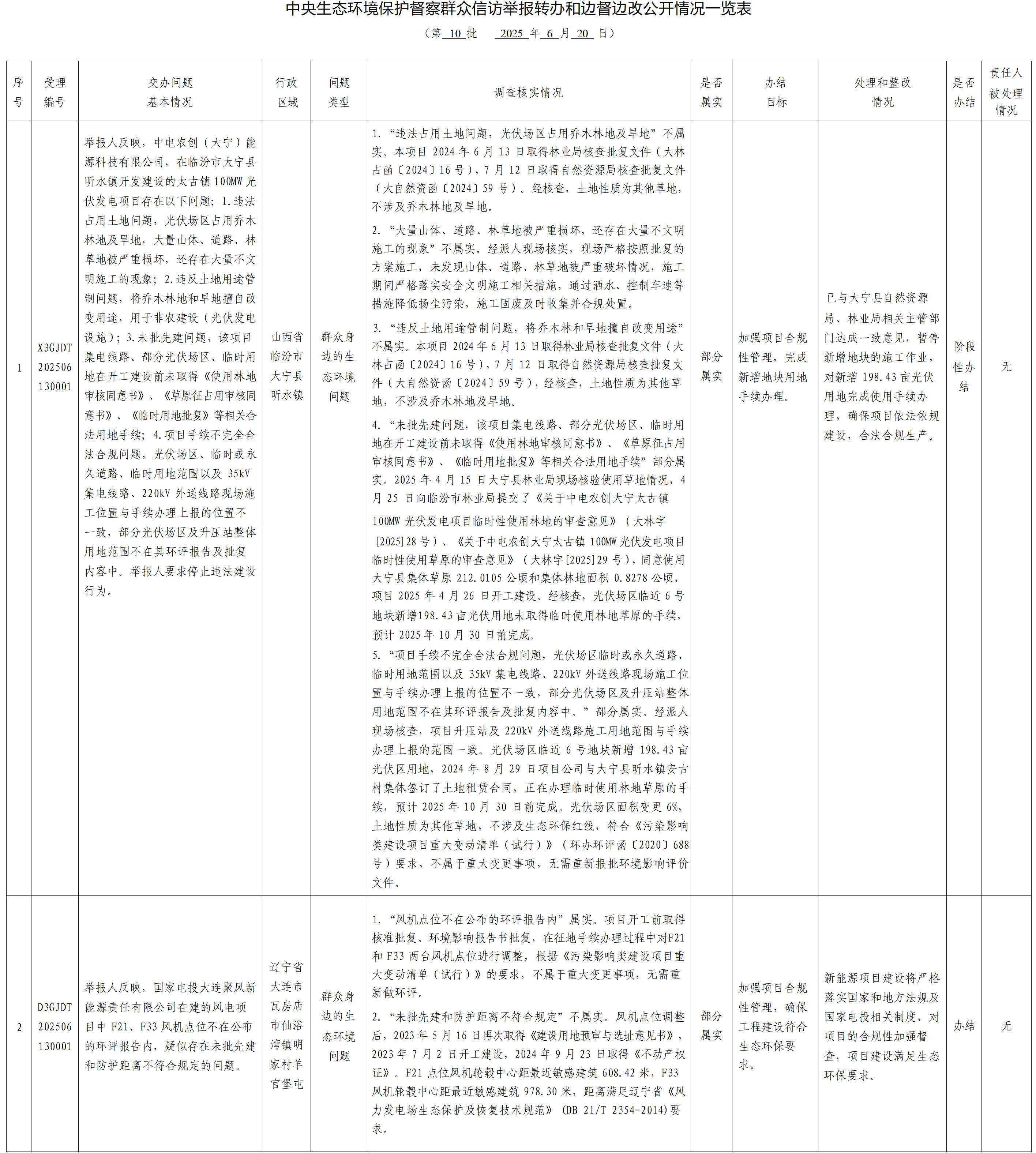 中央生态环境保护督察群众信访举报转办和边督边改公开情况一览表(第十批)