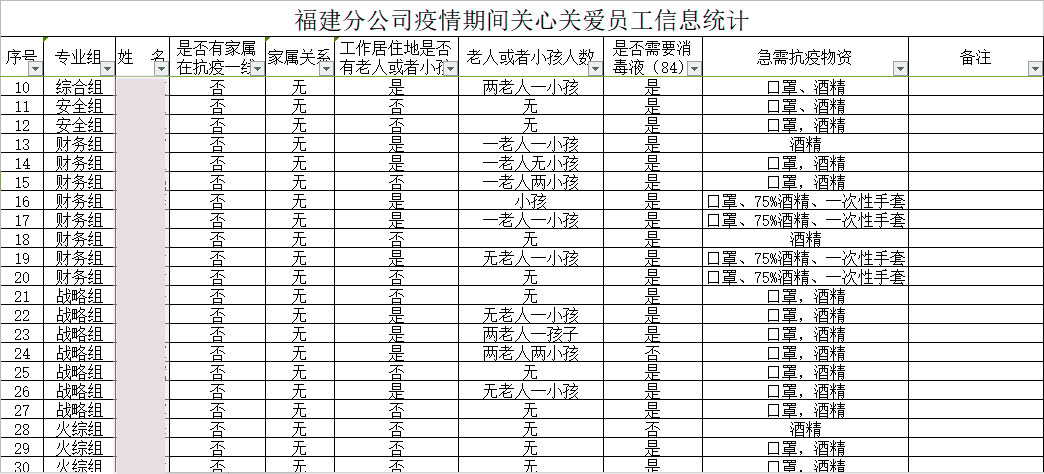 福建分公司摸查登记职工家庭防疫物资储备